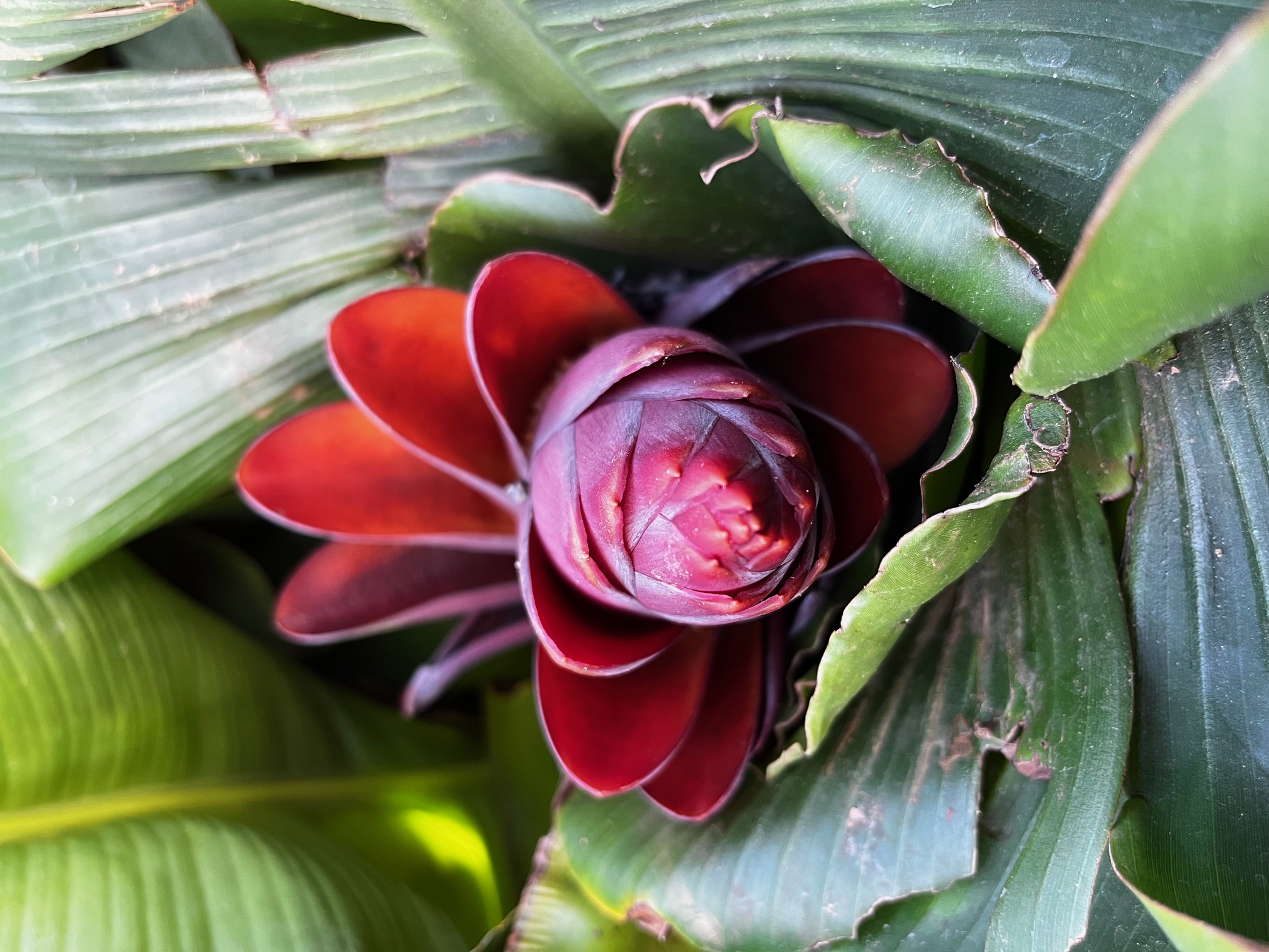 | 3年目を迎えたモンキーバナナ、葉が大きく成長して、まさか、葉の隙間に実が付いていると、成長の妨げになる葉は切り落とした |