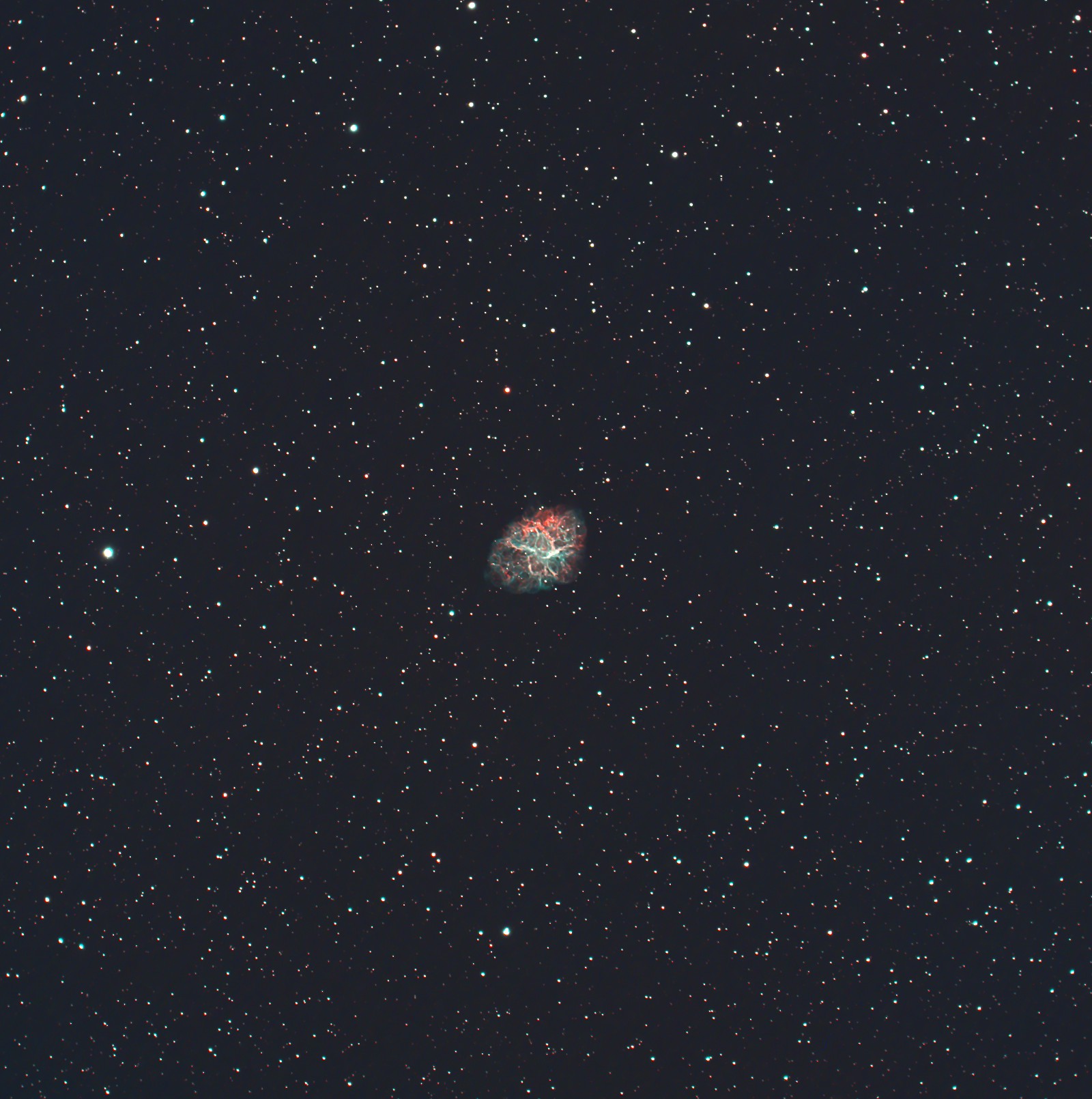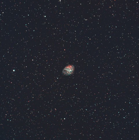 毎年廻ってくる星雲星団、ナローバンド撮影ではある程度の淡い星雲の描写は可能だが、分子雲の様な超淡い星雲は難しい。明るくてカラフルなカニ星雲は微細な構造を写しだすことが目標である。 |
